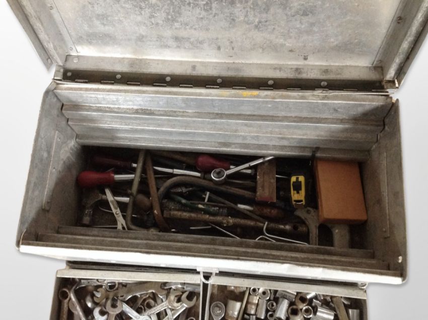 A painted metal tool chest containing spanners, sockets, etc.