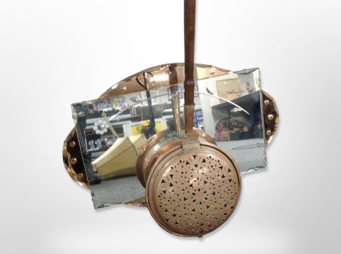 An Art Deco two-tone unframed mirror, width 67 cm and a Victorian copper bed warming pan
