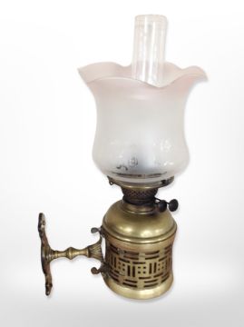 A brass Duplex wall-mounted oil lamp with frosted and etched shade and clear chimney, depth from wall 25cm.