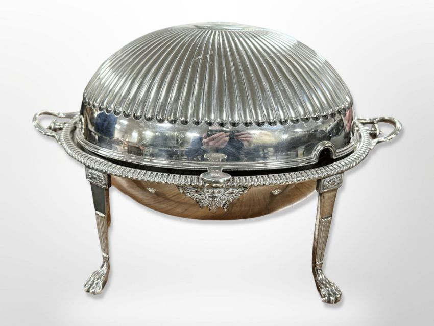 A silver-plated dome top revolving food cover on paw feet, width 35cm.