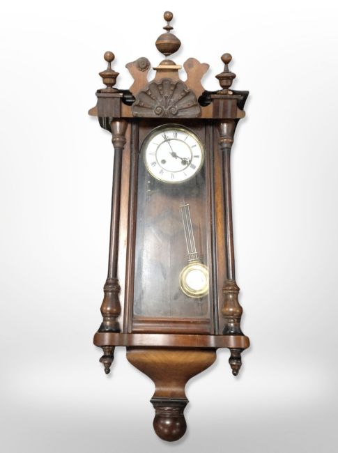 A continental walnut Vienna wall clock with enamelled dial.