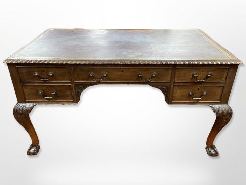 A late Victorian walnut writing desk, fitted five drawers to each side, with tooled leather inset top and gadrooned edge, raised on carved claw and ball feet, 137 cm x 77 cm x 76 cm