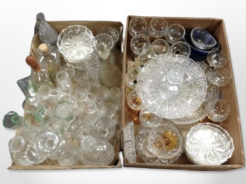 Assorted 20th-century glass wares including continental decanters, etched drinking glasses, bowls, etc. (2 boxes)