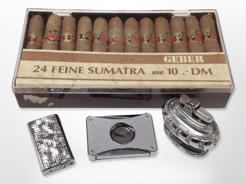 A pack of 24 Geber Feine Sumatra cigars, together with a Kingsway Juno lighter, a table lighter and a stainless steel cigar cutter.