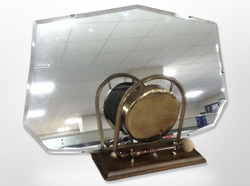 A brass gong with beater, on stand, together with an Art Deco frameless mirror, width 60cm.