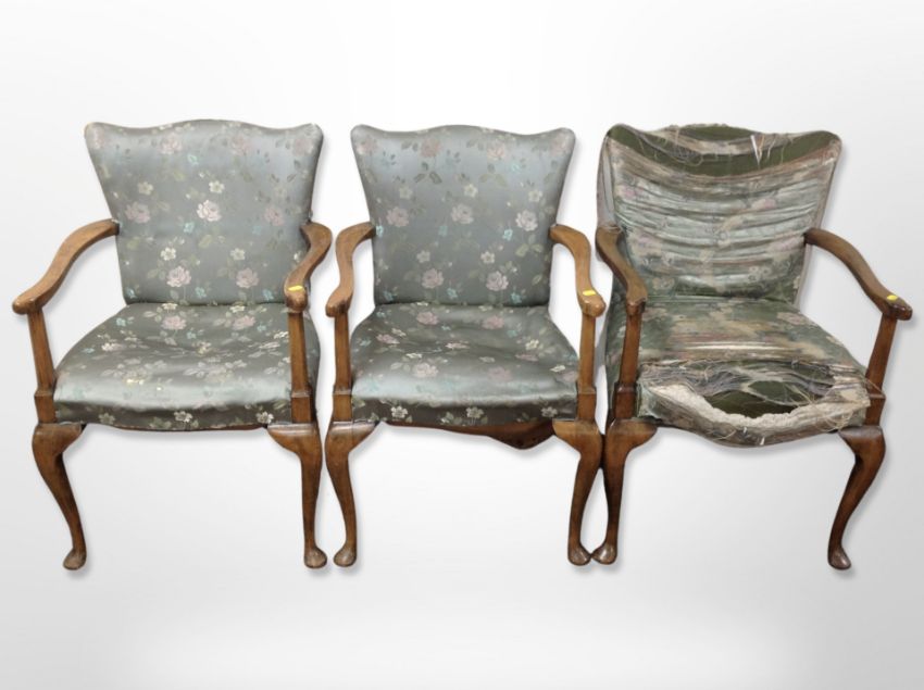 Three early 20th century carved beech framed armchairs in floral satin fabric