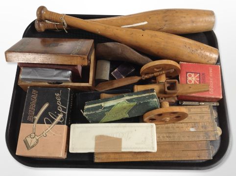 A group of folding rules, Hohner mouth organ, dominoes, pair of turned wooden juggling batons, oak trinket box, Gillette razor blades, etc.