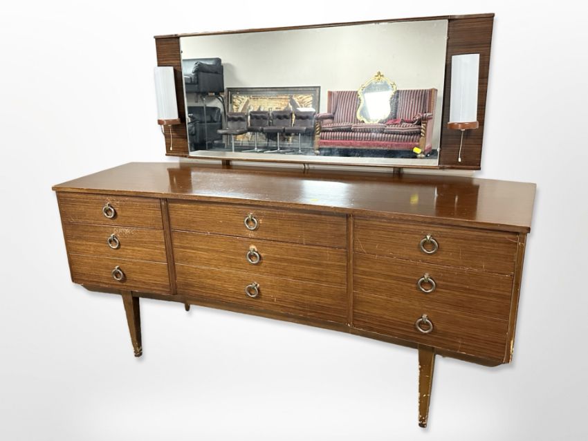 A 20th century teak inverted bow-front mirror back dressing table, 156 cm x 50 cm x 118 cm