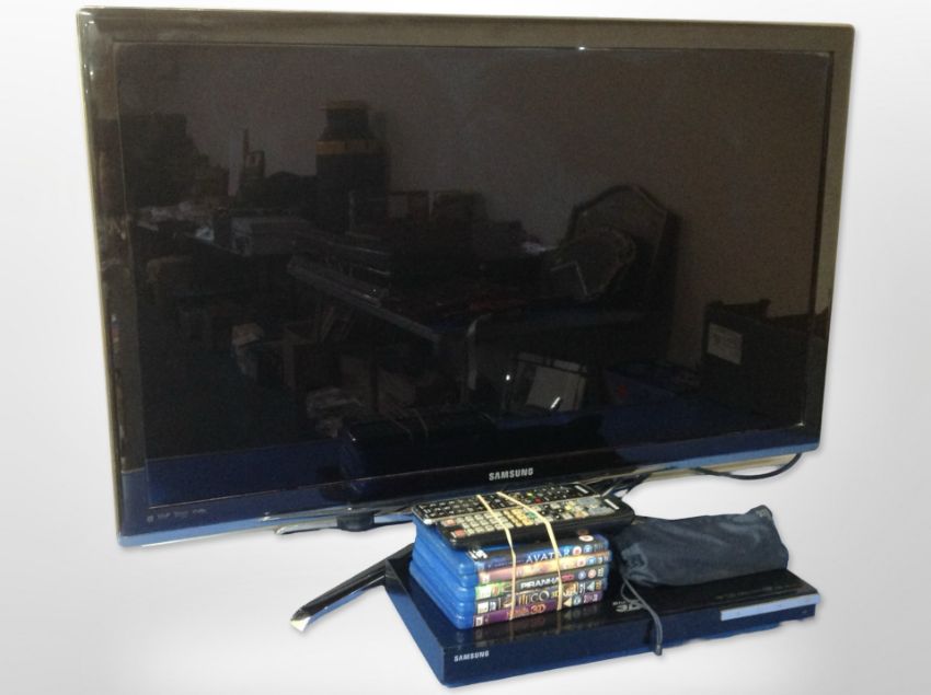 A Samsung 42-inch 3D TV, with remote, two pairs of 3D glasses, several 3D Blu-Rays and a Samsung 3D Blu-Ray player.