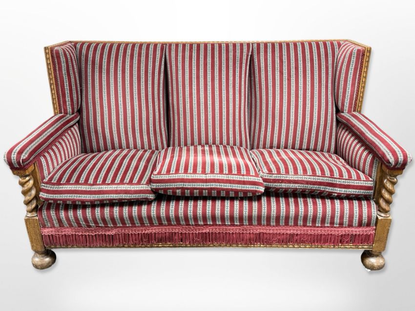 An early 20th century carved oak framed three-seater settee in striped upholstery, 178 cm x 86 cm x 104 cm
