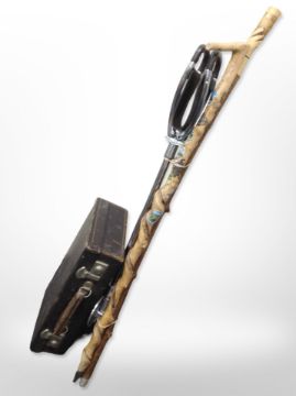 A shooting stick, two walking sticks, one bearing enamelled badges, and a small vintage luggage case.