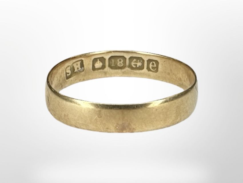 An 18ct yellow gold band ring, size J.