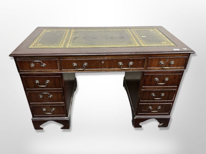A reproduction mahogany twin pedestal writing desk with tooled leather top, 122 cm x 61 cm x 76 cm