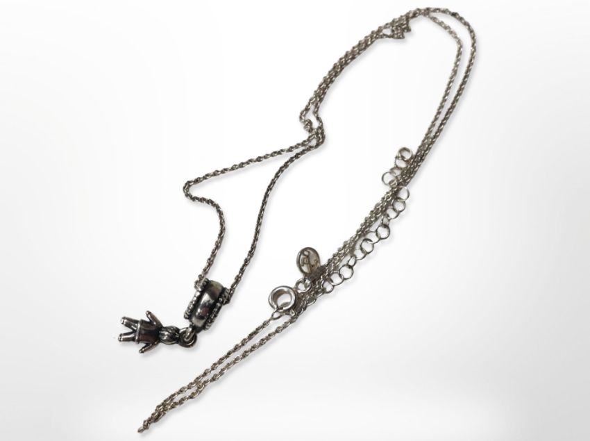 A Pandora silver doll charm pendant on chain.