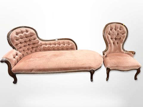 A Victorian style carved chaise loungue in pink buttoned dralon and a matching lady's armchair