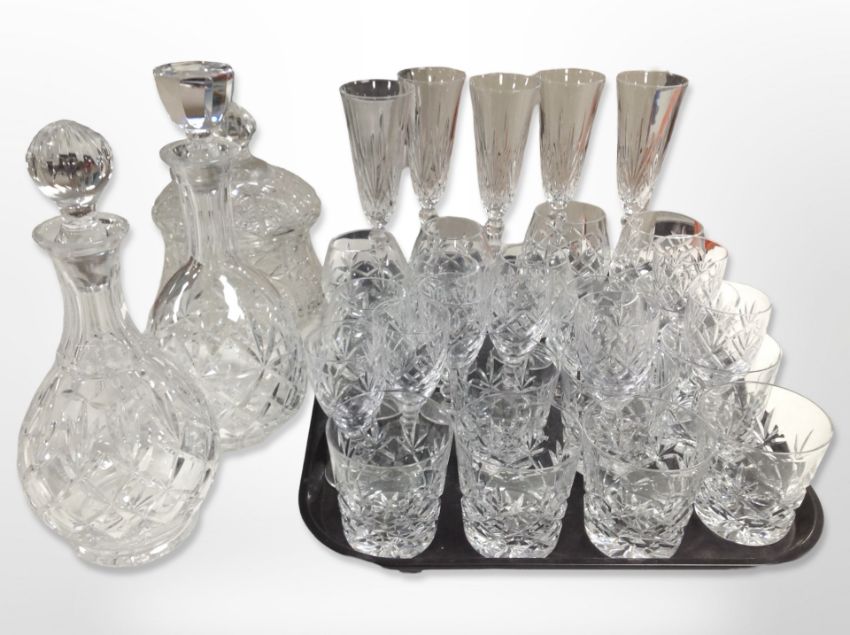 A collection of crystal drinking glasses, two decanters, and a lidded jar, etc.