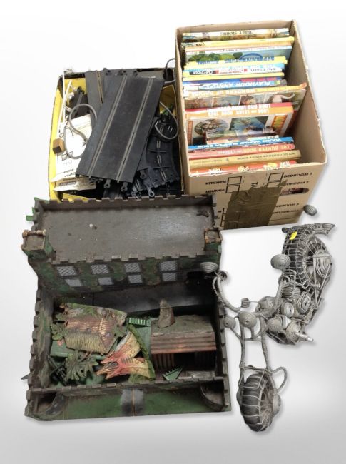 A group of children's annuals, together with a quantity of Scalextric track, wire metal model of a motorbike, and a child's model castle. (2 boxes)