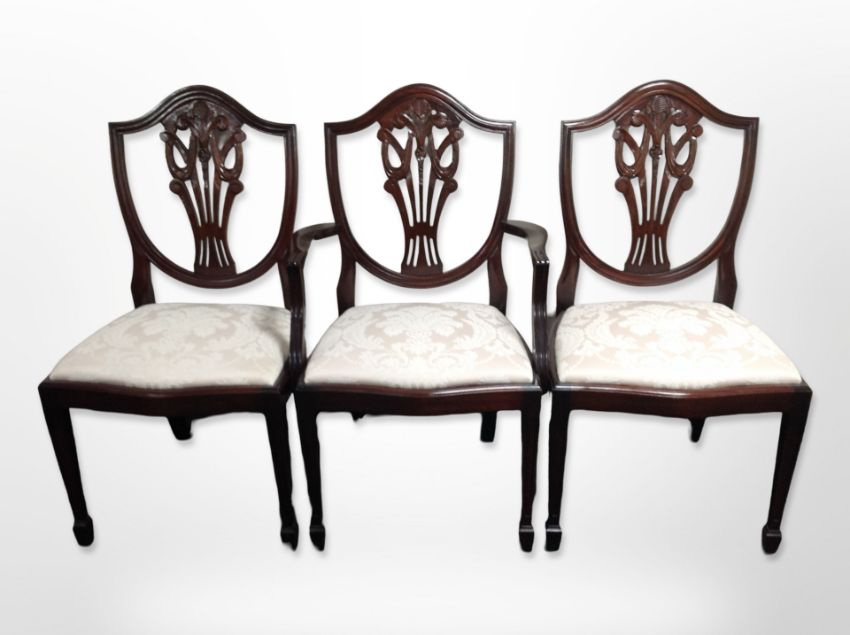 A reproduction mahogany extending dining table with one leaf, total length 235 cm x 100 cm x 77 cm together with six shield back dining chairs