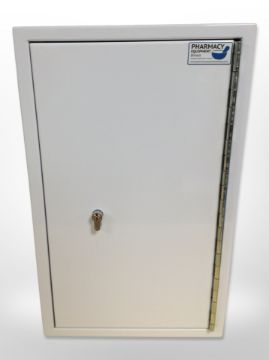 An enamelled metal pharmacy cabinet, with keys, width 33 cm