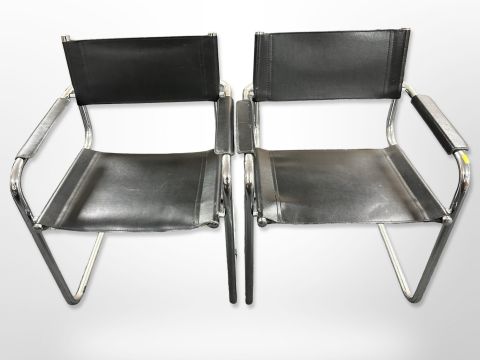 A pair of chrome and black stitched vinyl armchairs, width 60 cm
