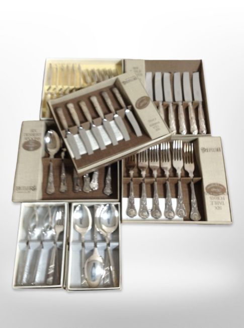 A group of boxed stainless steel and EPNS cutlery sets.