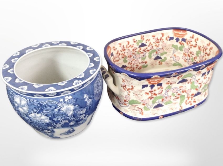 A reproduction Staffordshire Ironstone twin-handled footbath, width 46cm, together with a Chinese blue and white porcelain jardiniere.