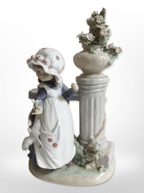 A Lladró figure of a lady with a baby in a pram, together with a further figure of a girl standing beside a stone column.
