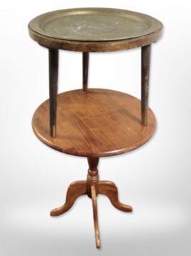 A reproduction mahogany occasional table and a further tripod table with engraved eastern brass inset dish