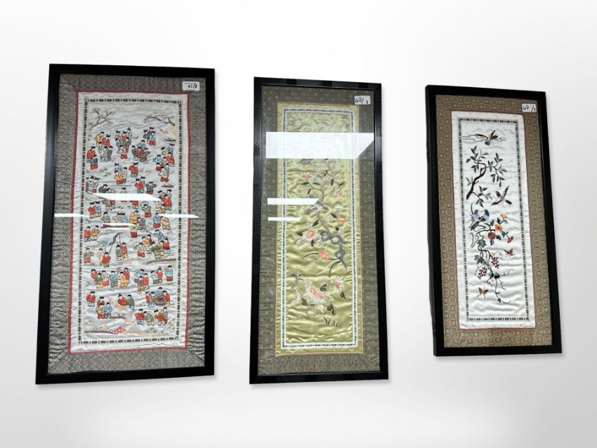 Twentieth Century Japanese School : Children at Play in a Garden, colourful embrodery on silk, 64 cm x 32 cm, together with two further embroideries depicting blossoming boughs, all three parts framed. (3)