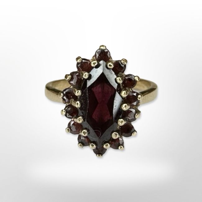 A 9ct yellow gold ruby cluster ring, size L.