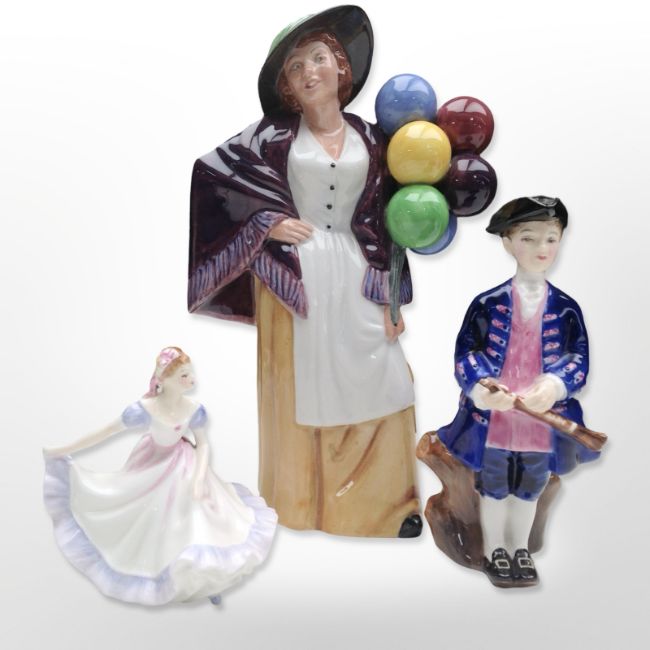 A Royal Doulton figure, 'Balloon Lady' HN 2935, together with two further miniature figures, 'Boy from Williamsburg' and 'Ninette'.