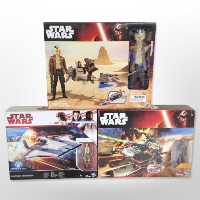 Three Hasbro Disney Star Wars figures, Resistance A-Wing Fighter, Desert Landspeeder, and Speeder Bike Moto Speeder, boxed.