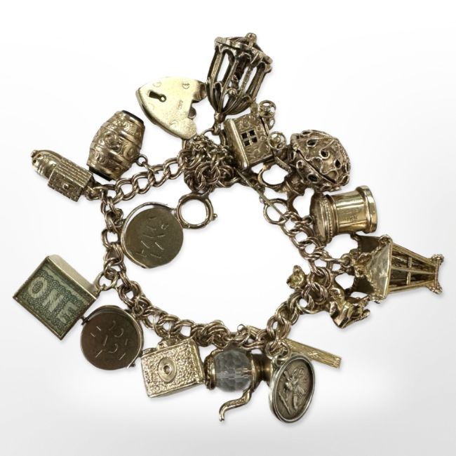 46.7g gross. One charm is silver, most charms are marked 375, some yellow metal charms apparently un-marked but presumed 9ct.