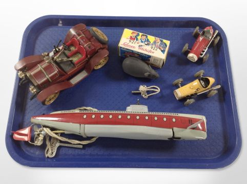 A group of Schuco wind up toys including mouse in box, tin plate submarine, two race cars and a classic car