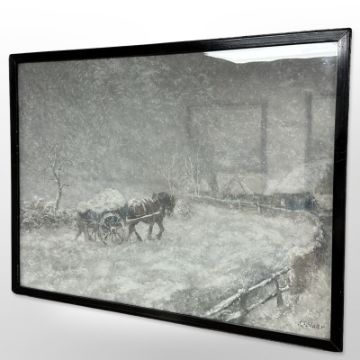 John Falconar Slater (1857-1937) A farmer, horse and cart pushing through the snow, oil on board, 45cm by 61cm
