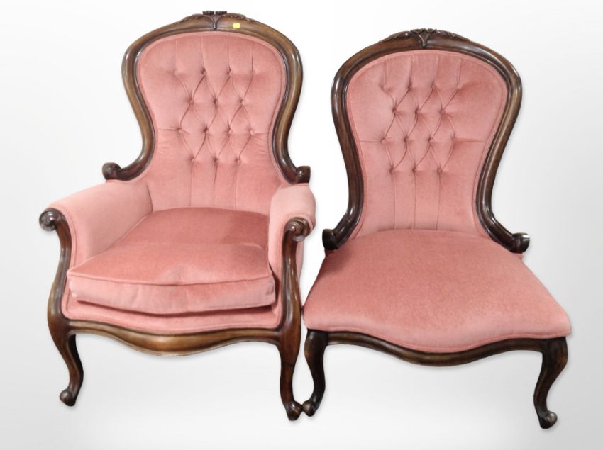 A pair of Victorian style carved mahogany lady's and a gent's armchairs in pink buttoned dralon