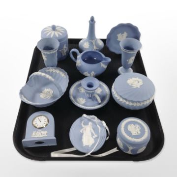 A group of Wedgwood blue and white Jasperware cabinet china.