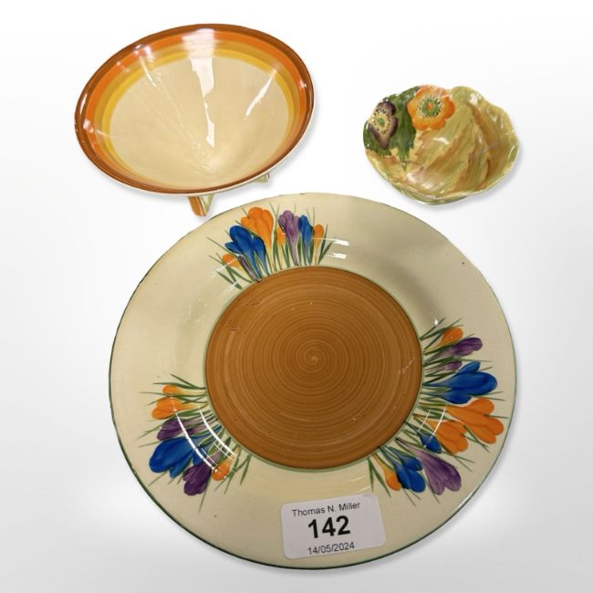 A Clarice Cliff for Newport Pottery Bizarre Crocus-patterned plate, diameter 17.5cm, together with a further conical bowl on X-shaped pedestal and one other floral bowl. (3)