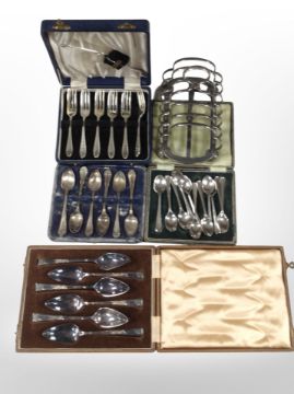 A group of boxed cutlery sets including grapefruit spoons, cutlery sets etc, together with Walker & Hall silver plated toast rack
