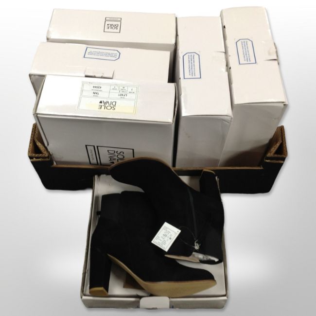 Six pairs of lady's Sole Diva suede-heeled boots, sizes 7 and 8.