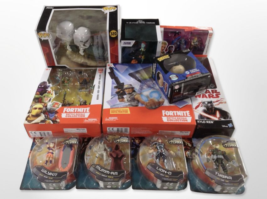 11 Funko Pop!, Epic Games and other figurines including Fortnite, Star Wars, Thundercats, etc., boxed.