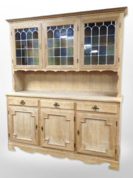 A Danish blond oak dresser with stained leaded glass cabinet doors, width 152 cm x 44 cm deep x 180 cm high