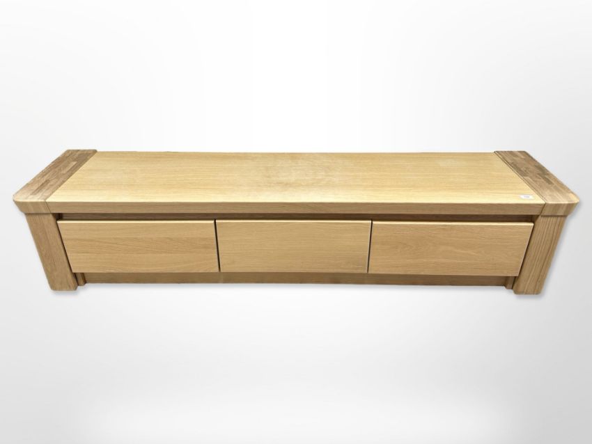 A contemporary oak Moreno Sokkell entertainment low sideboard fitted with two drawers, with central fall-front, 186cm wide x 40cm high x 40cm deep