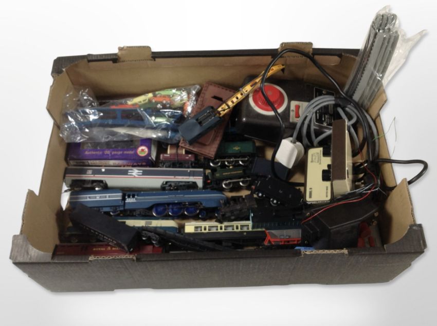 A quantity of 00 gauge locomotives and passenger cars including Hornby, Dapol, Tri-ang, together with a Tri-ang RP13 power unit, small quantity of track, die-cast cars, etc. (1 box)