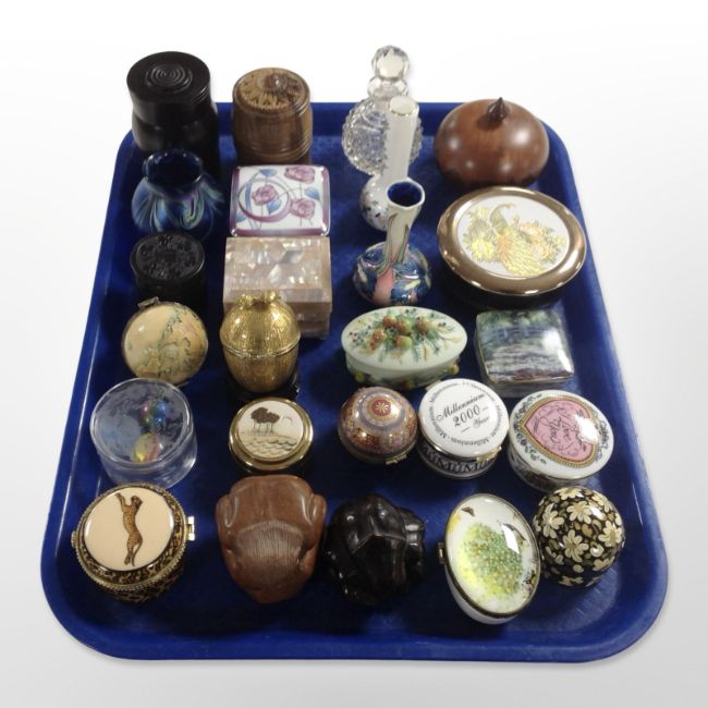 A collection of trinket boxes including Franklin, Falcon China, Past Times, together with wooden carvings, mother of pearl trinket box, okra blue iridescent swirl glass vase, Old Tupton Ware tube-lined vase, etc.