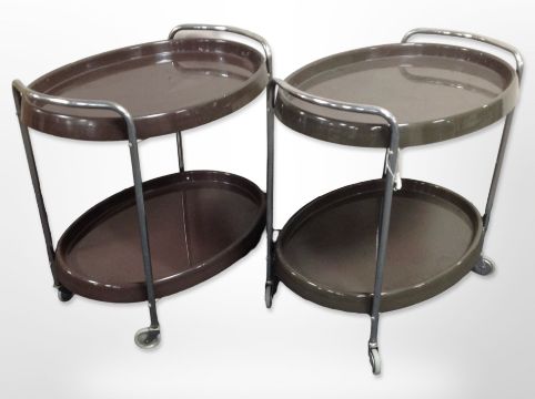 A pair of late 20th century Scandinavian plastic and chrome oval serving trolleys on castors, 63 cm x 60 cm high