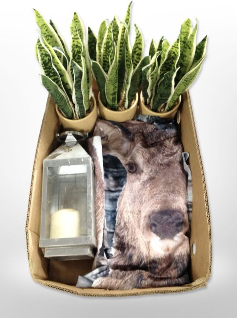 Three artificial plants in pots, a candle lantern, polyester throw. (1 box)