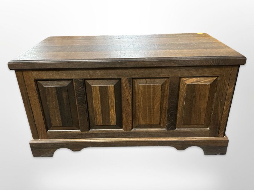 A reproduction panelled oak coffer, 84 cm wide x 41 cm deep x 45 cm high