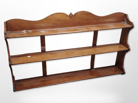 A 20th century mahogany three tier wall shelf, width 114 cm