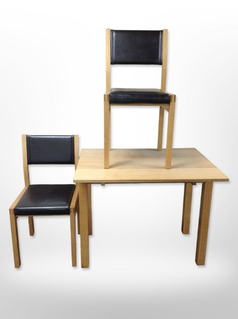 A contemporary oak pull-out dining table, 90 cm x 50 cm x 74 cm (unextended) and a pair of chairs